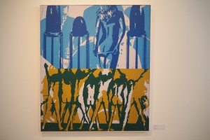 Wie so manch anderen zog es ihn und seine Frau in den Siebzigern von der damals noch eingeschlossenen Großstadt aufs Land. Die Wahl fiel auf Dithmarschen, wo beide viele Jahre lebten und arbeiteten. Die Tiere und der Kohl, die jetzt in seinen Bildern auftauchen, verdrängen die ohnehin schon relativ dünn gesäten Menschendarstellungen. Sie posieren selbstbewusst vor Angst einflößenden Symbolen einer bedrohlichen Zukunftsentwicklung: Düsenjäger, Atomkraftweke, oder vor mahnenden Relikten aus Deutschlands jüngerer Vergangenheit: Bunkerbeton ragt zwischen friedlich grasendem Nutzvieh und dem Deichgrün.