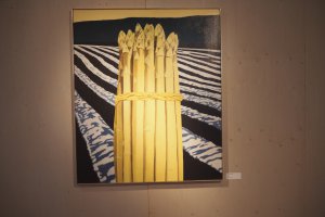 Aber es gibt auch Stillleben, z.B. das Spargelbündel; aufrecht und schon verpackt steht es "auf deutscher Scholle". Und überlässt es dem Betrachter, sich seinen Teil zu denken. Deutlich mag die Absicht des Malers werden, betrachtet man Vahles Spargel-Aquarell mit dem hintersinnigen Titel "Naturprodukt" in diesem Zusammenhang.