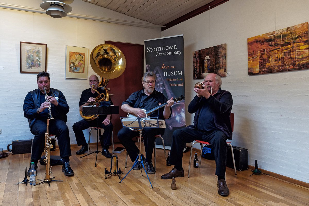 Die Vernissage, eröffnet von Steen Schröder , Vereinsvorstand, und Andrea Claussen wurde musikalisch von der Stormtown Jazzcompany begleitet. Auch in diesem Jahr strömten die Besucher auf den Mikkelberg. Über 70 Menschen genossen die schöne Ausstellung und die gute Stimmung.